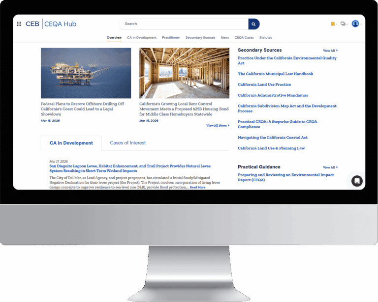 All in One CEQA-Focused Environment: Cases, filings, news, secondary sources, statutes, and practical guidance surfaced together inside the CEB platform, organized specifically around CEQA practice.