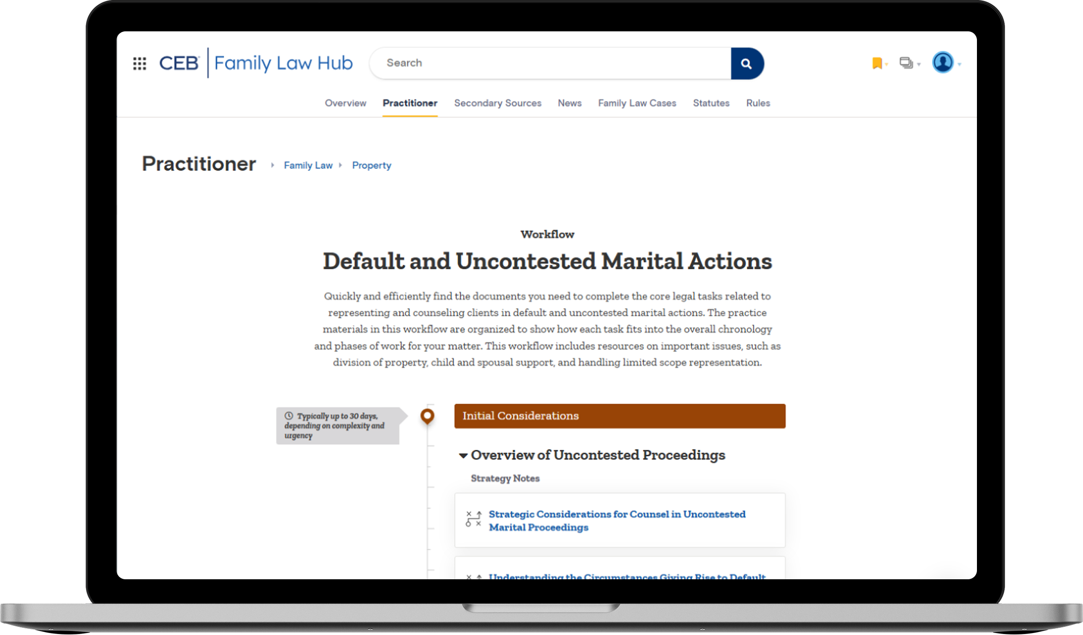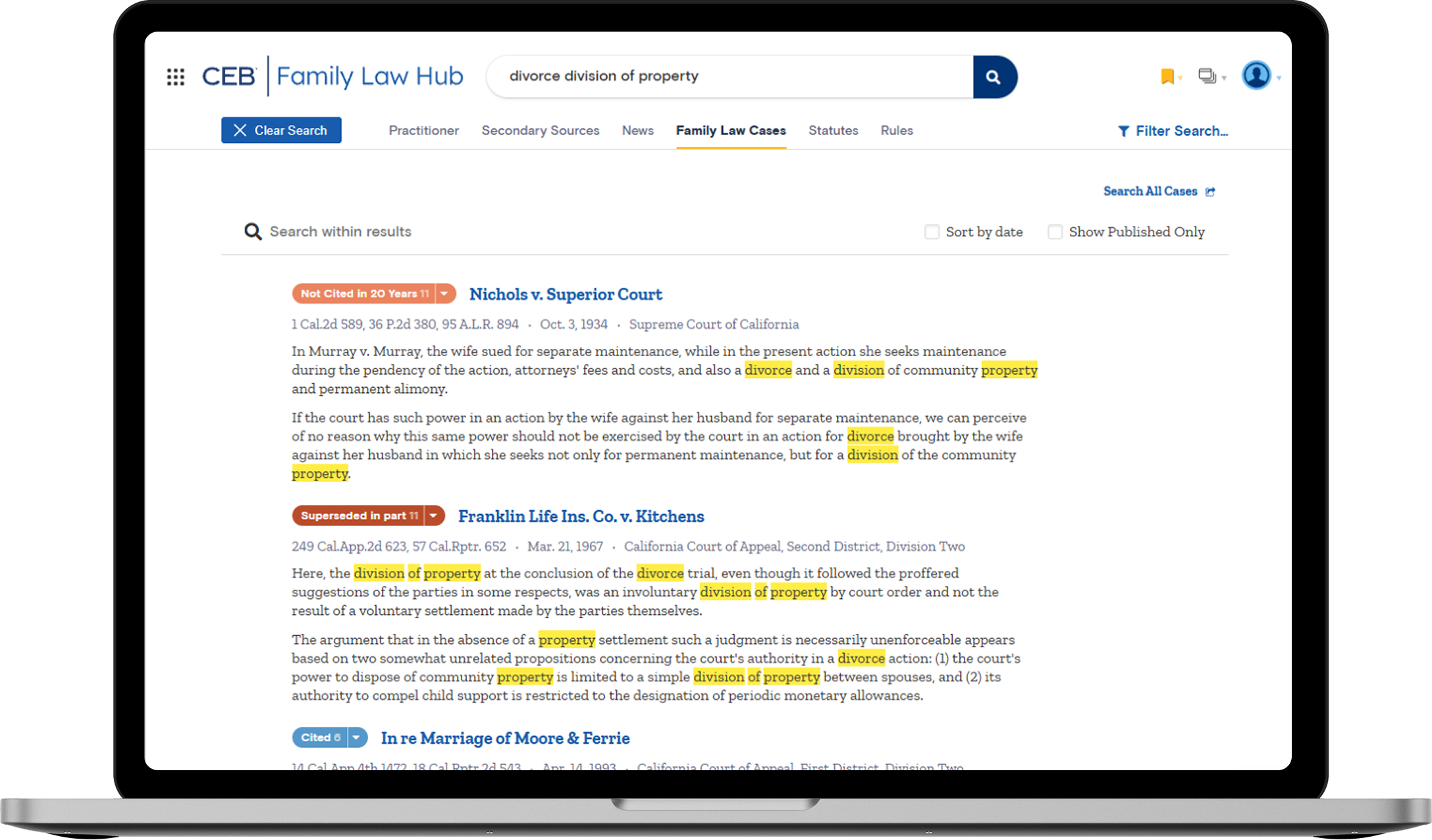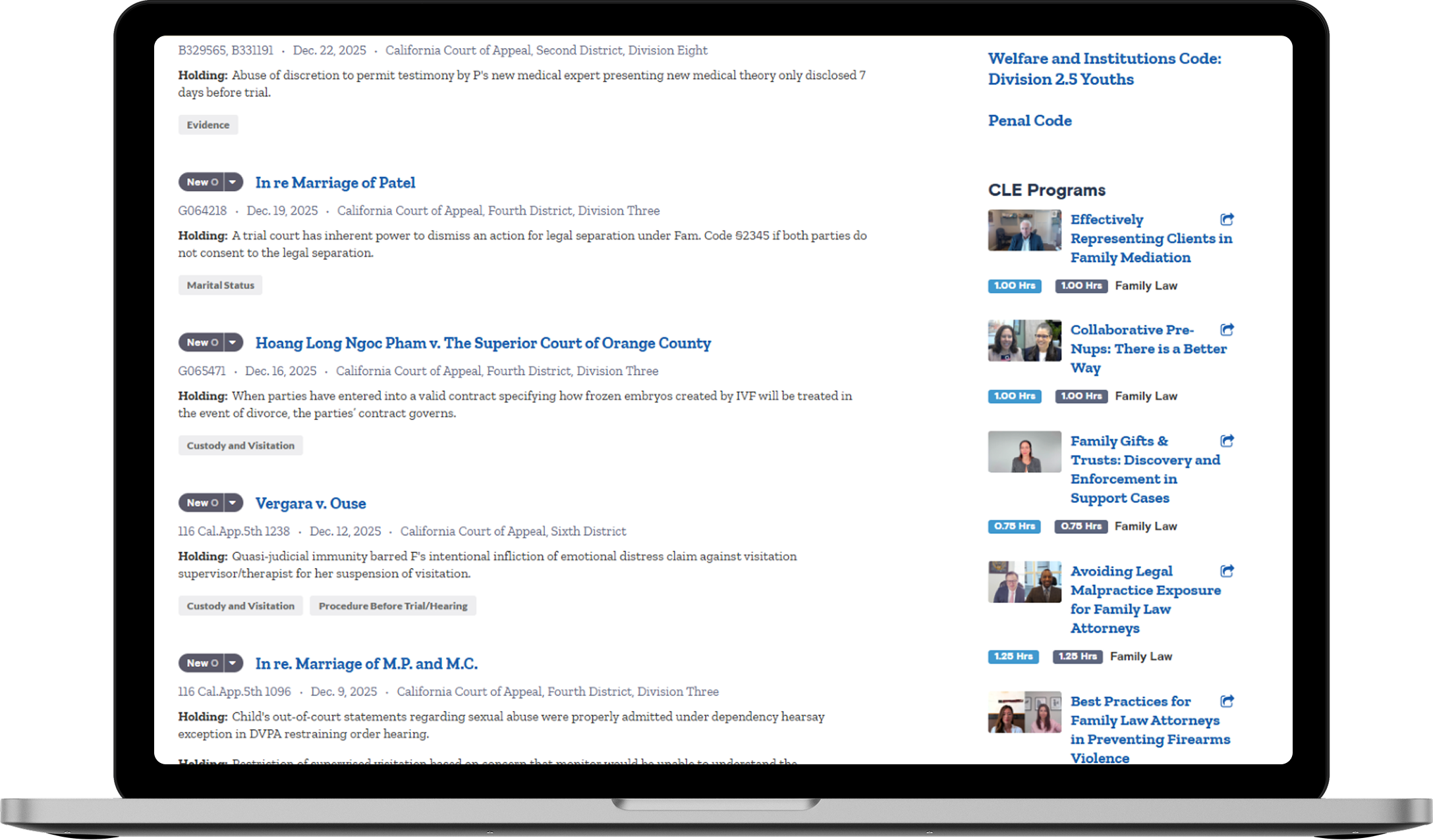 Family Law Hub gives California family law practitioners a single, integrated environment to research, advise, and stay current, without switching platforms or worrying about missed updates.