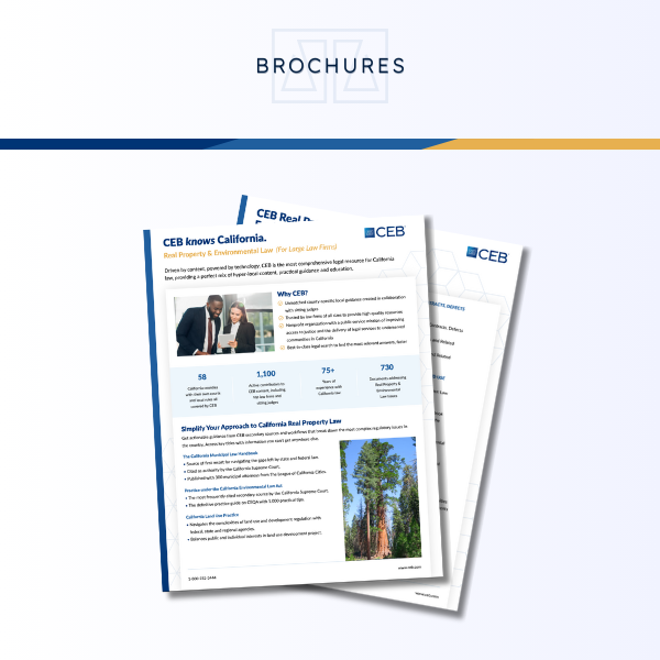 Real Property and Environmental Law for Large Law Firms: Get actionable guidance from CEB secondary sources and workflows that break down the most complex regulatory issues in the country. Access key titles with information you can’t get anywhere else.