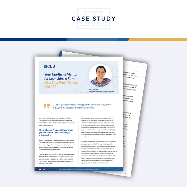 Discover how CEB’s comprehensive legal research tools can be a game-changer for solo and small firm practitioners in our latest case study, featuring the inspiring journey of California attorney Jake Pillard.