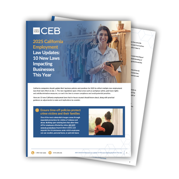 Thank you for requesting the new resource, 2025 California Employment Law Updates: 10 New Laws Impacting Businesses This Year You may download it HERE. We will also send you an email with the download link. Want to try CEB exclusive California content for free? Click HERE for your free trial. Claim Trial