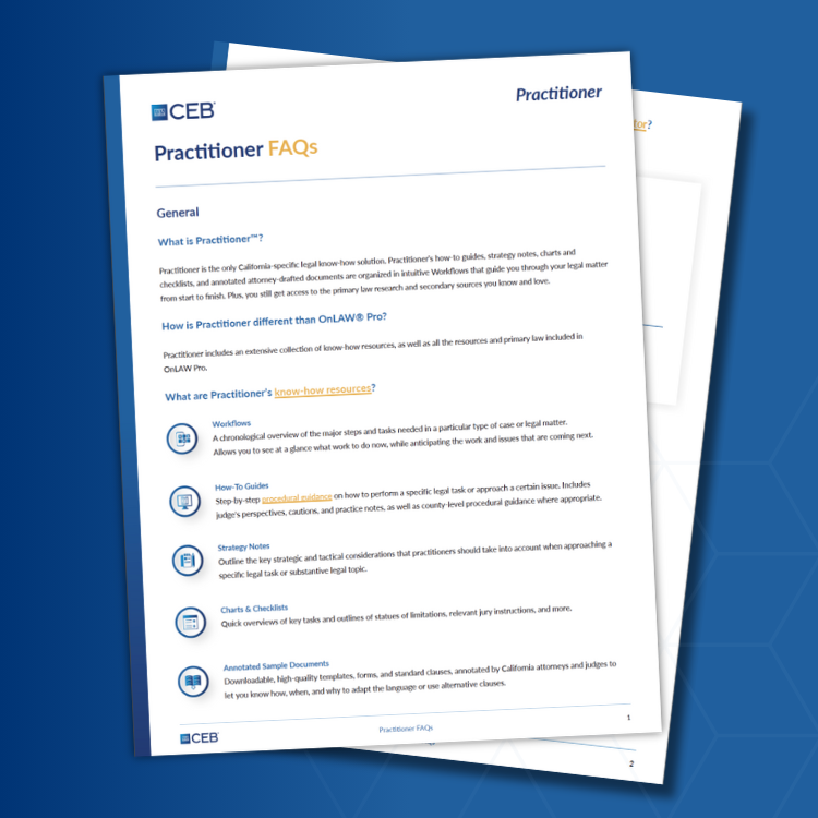 California’s most trusted legal resource, backed by expert insight, unmatched authority, and over 75 years of delivering practical guidance you can rely on. See why more legal professionals use CEB.